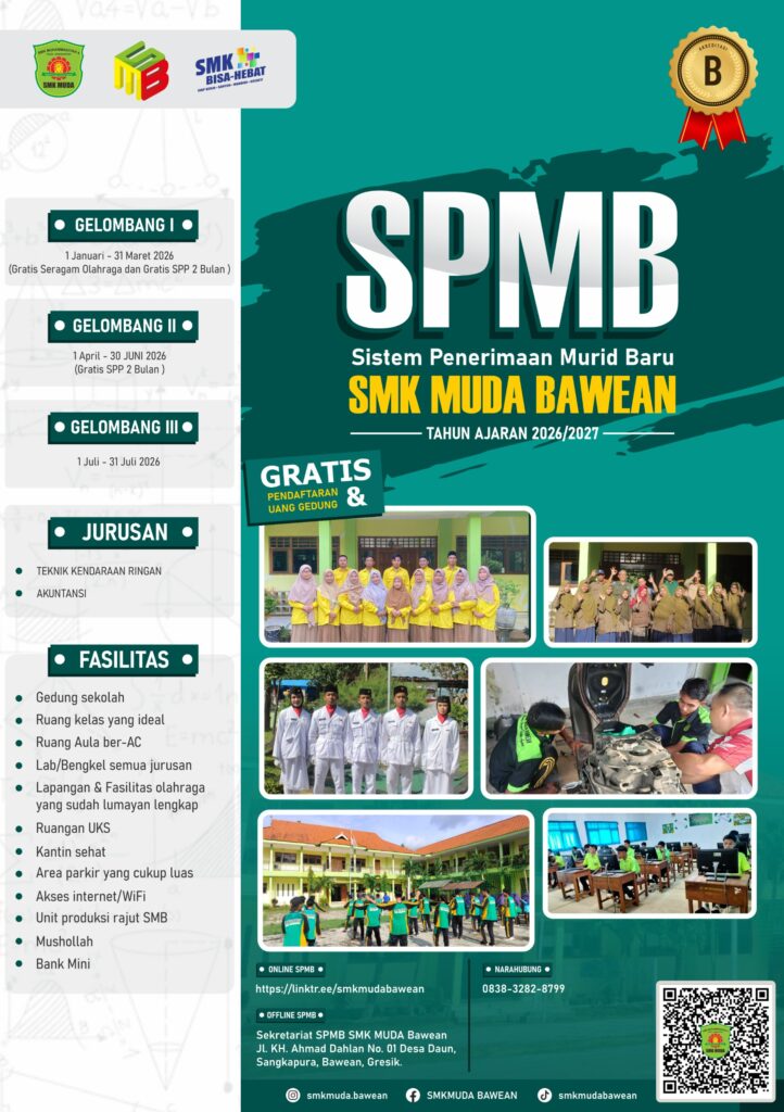 Untuk informasi lebih lanjut, silahkan kunjungi website resmi SMK MUHAMMADIYAH 4 SANGKAPURA atau hubungi kontak yang telah disediakan. #admin Berikut Brosur dan Poster SPMB SMK MUDA Bawean :